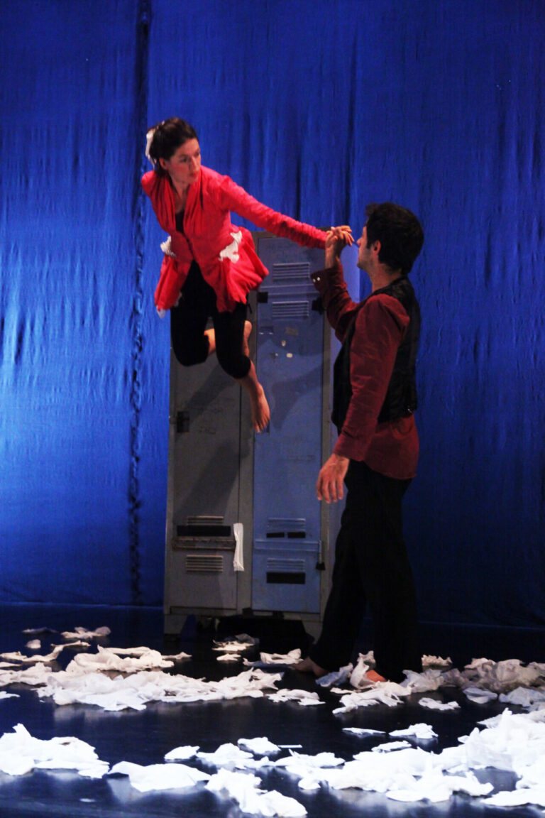 Un garçon rêveur et triste voit son univers austère brutalement réveillé par le vol malicieux d’une petite chose volante qui cherche à le faire sortir de sa mélancolie. Astuces scéniques, surprises burlesques, le déroulé du spectacle a suscité de joyeux éclats de plaisir chez les nombreux enfants présents. Les deux comédiens acrobates ont fait frémir la salle avec leurs envolées énigmatiques, leurs portés et leurs équilibres savamment maîtrisés, au service d’une histoire pleine de douceur et de tendresse