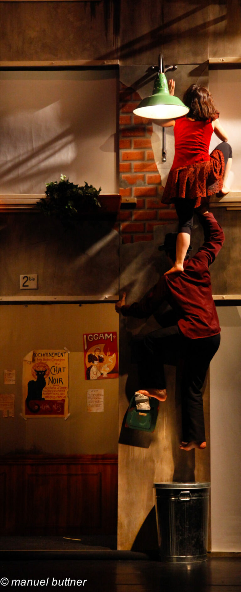 Parfois simples ombres animées, parfois en chair et en os, tous vivent leur petite vie d’appartement, entre repas et soirées télé. Il suffit alors d’une rencontre pour que l’amour arrive. L’immeuble en est tout chamboulé. Les lois de la gravité aussi et plus encore quand arrive un enfant plus tôt que prévu ! Avec « Rue de Guingois », la Cie Prise de pied évoque les rapports humains et les relations hommes-femmes. Pour cela, les comédiens utilisent le corps et les portés acrobatiques, et les jeux d’ombre sont leurs moyens d’expression.